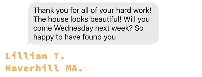 We serve cleaning in all north of Boston area including Peabody, Salem, Danvers, Lynn, Beverly, Ipswich, Wenham, Gloucester, Rockport, Marblehead, Reading, Stoneham, Topsfield, Boxford, Haverhill, Woburn and much more.